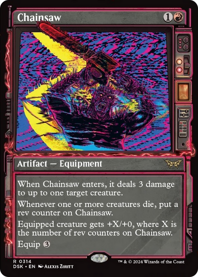 Equipped creature gets +X/+0, where X is the number of rev counters on Chainsaw.