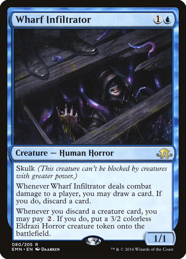 Whenever Wharf Infiltrator deals combat damage to a player, you may draw a card. If you do, discard a card.