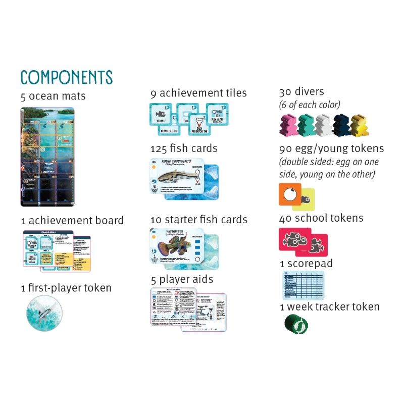 * An upgrade pack is available here that replaces the cardboard egg, young, and school tokens with wooden and plastic tokens.