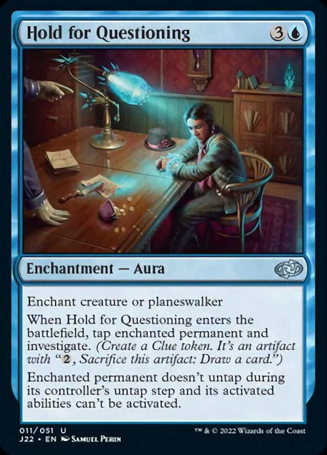 When Hold for Questioning enters the battlefield, tap enchanted permanent and investigate. (Create a Clue token. It's an artifact with "{2}, Sacrifice this artifact: Draw a card.")