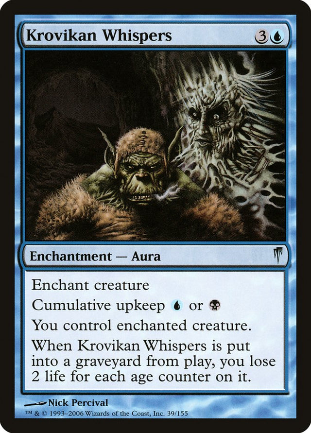 When Krovikan Whispers is put into a graveyard from the battlefield, you lose 2 life for each age counter on it.