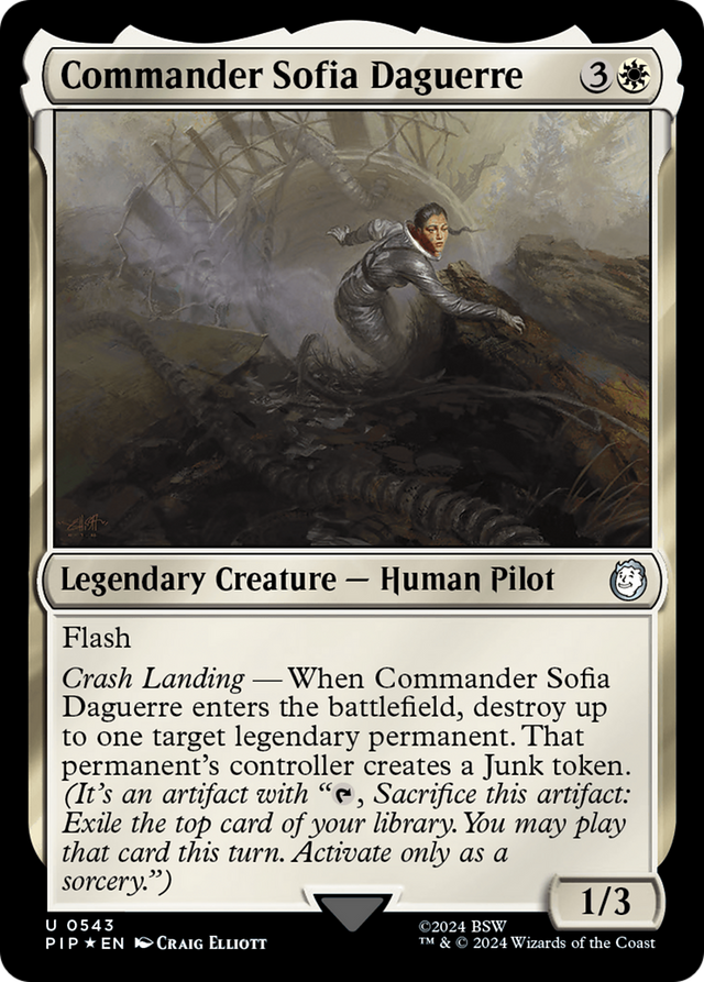 Crash Landing — When Commander Sofia Daguerre enters the battlefield, destroy up to one target legendary permanent. That permanent's controller creates a Junk token. (It's an artifact with "{T}, Sacrifice this artifact: Exile the top card of your library. You may play that card this turn. Activate only as a sorcery.")