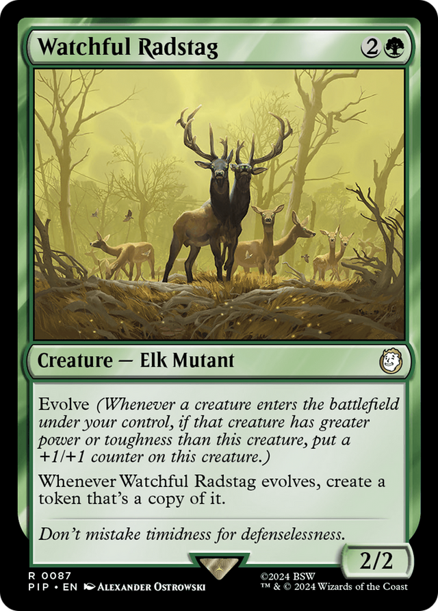 Whenever Watchful Radstag evolves, create a token that's a copy of it.