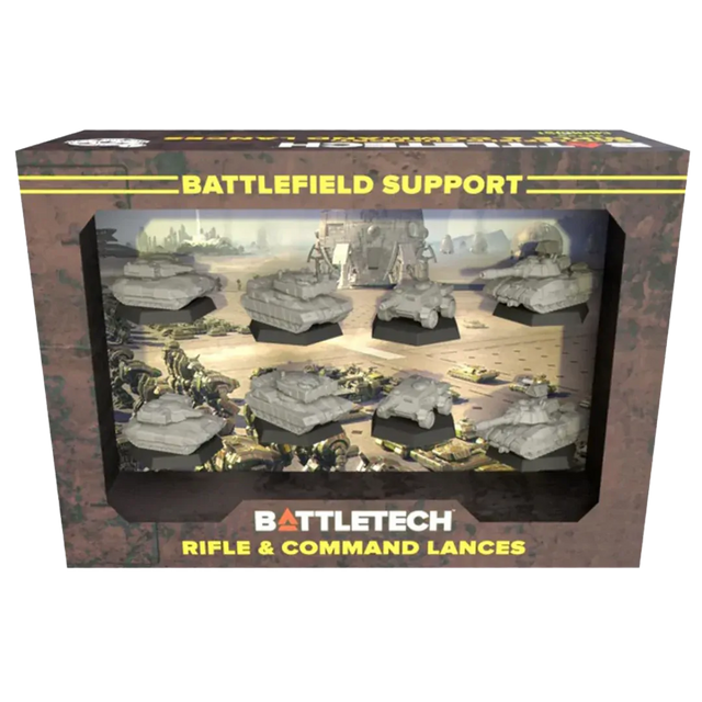 The BattleTech Battlefield Support: Rifle & Command is a collection of eight plastic miniatures for use in the classic BattleTech tabletop and Alpha Strike games. The box also provides four dry-erase cards, which are intended to directly support Alpha Strike gameplay, and four new crew Cards.