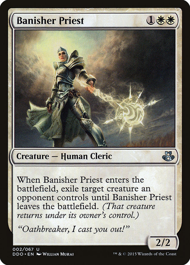When Banisher Priest enters the battlefield, exile target creature an opponent controls until Banisher Priest leaves the battlefield. (That creature returns under its owner's control.)