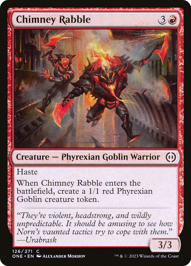 When Chimney Rabble enters the battlefield, create a 1/1 red Phyrexian Goblin creature token.