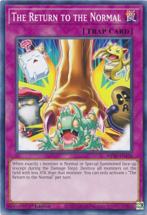 When exactly 1 monster is Normal or Special Summoned face-up (except during the Damage Step): Destroy all monsters on the field with less ATK than that monster. You can only activate 1 "The Return to the Normal" per turn.
