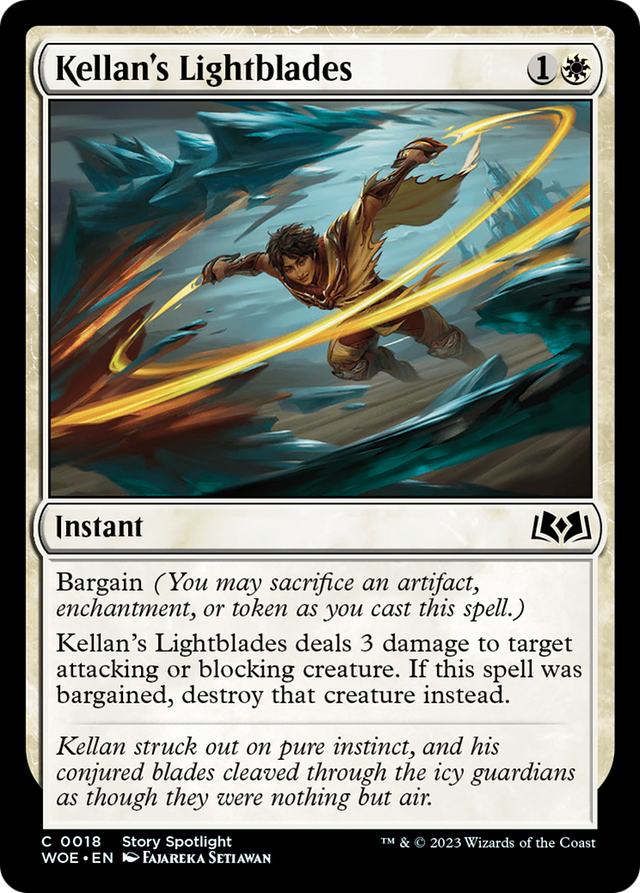 Kellan's Lightblades deals 3 damage to target attacking or blocking creature. If this spell was bargained, destroy that creature instead.