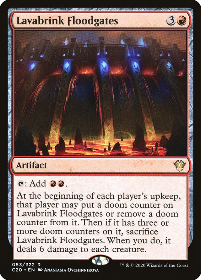 At the beginning of each player's upkeep, that player may put a doom counter on Lavabrink Floodgates or remove a doom counter from it. Then if it has three or more doom counters on it, sacrifice Lavabrink Floodgates. When you do, it deals 6 damage to each creature.