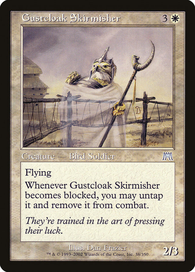 Whenever Gustcloak Skirmisher becomes blocked, you may untap it and remove it from combat.