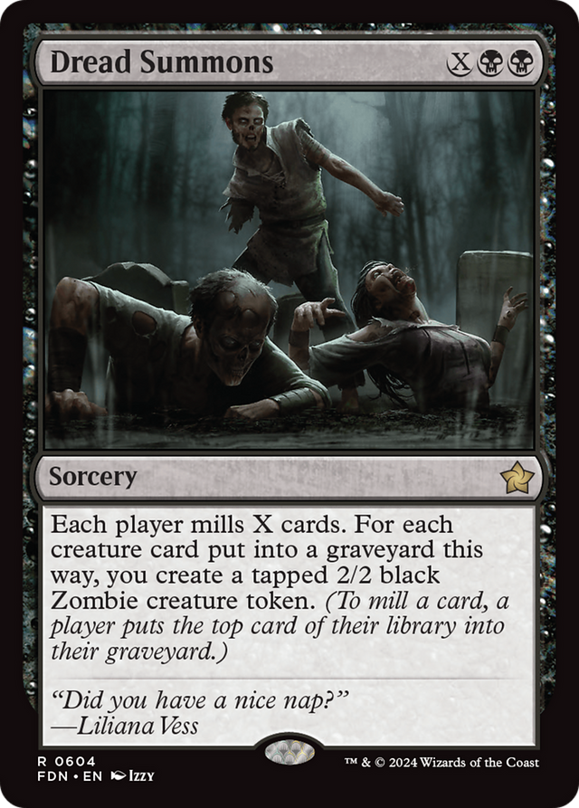 Each player mills X cards. For each creature card put into a graveyard this way, you create a tapped 2/2 black Zombie creature token.