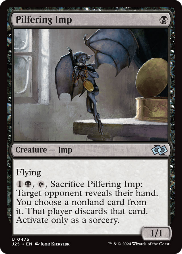 {1}{B}, {T}, Sacrifice Pilfering Imp: Target opponent reveals their hand. You choose a nonland card from it. That player discards that card. Activate only as a sorcery.