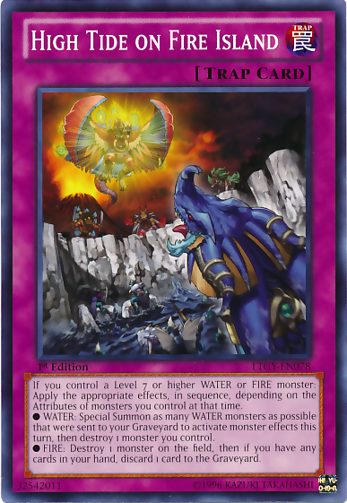 If you control a Level 7 or higher WATER of FIRE monster: Apply the appropriate, in sequence, depending on the Attributes of monsters you control at that time. •WATER: Special Summon as many WATER monsters as possible that were sent to your Graveyard to activate monster effects this turn, then destroy 1 monster you control. •FIRE: Destroy 1 monster on the field, then if you have any cards in your hand, discard 1 card to the Graveyard.