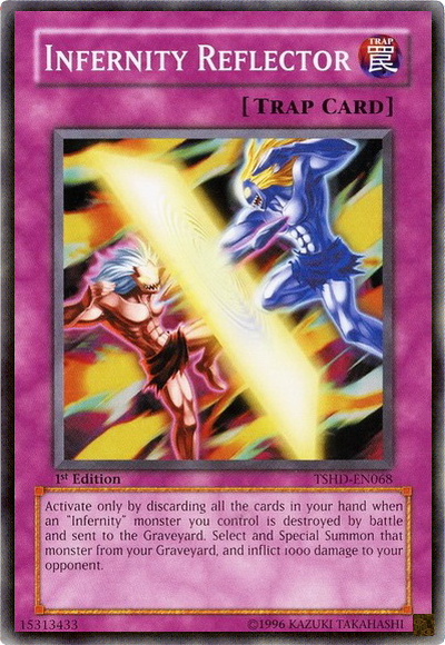 Activate only by discarding all the cards in your hand when an "Infernity" monsters you control is destroyed by battle and sent to the Graveyard. Select and Special Summon that monster from your Graveyard, and inflict 1000 damage to your opponent.