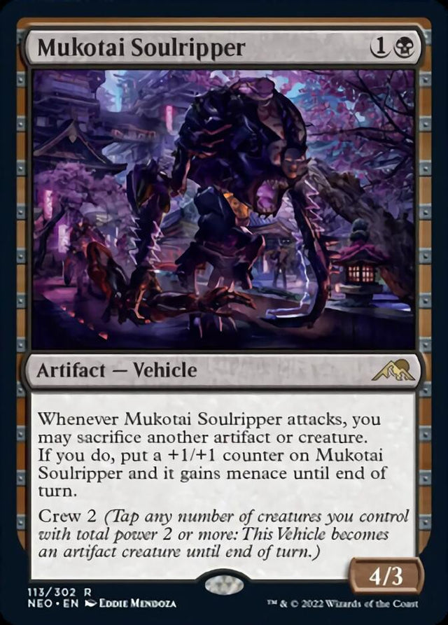 Whenever Mukotai Soulripper attacks, you may sacrifice another artifact or creature. If you do, put a +1/+1 counter on Mukotai Soulripper and it gains menace until end of turn.