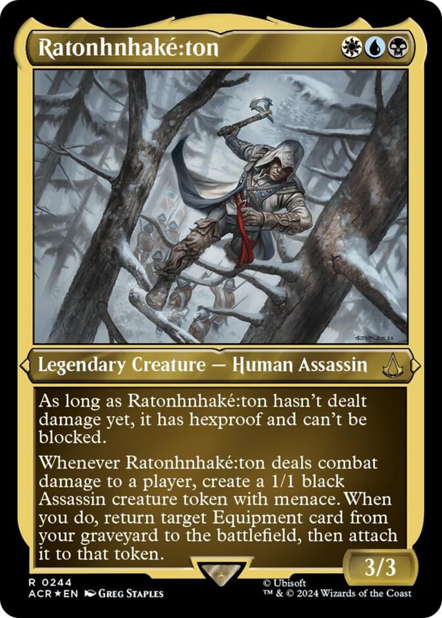 Whenever Ratonhnhaké꞉ton deals combat damage to a player, create a 1/1 black Assassin creature token with menace. When you do, return target Equipment card from your graveyard to the battlefield, then attach it to that token.