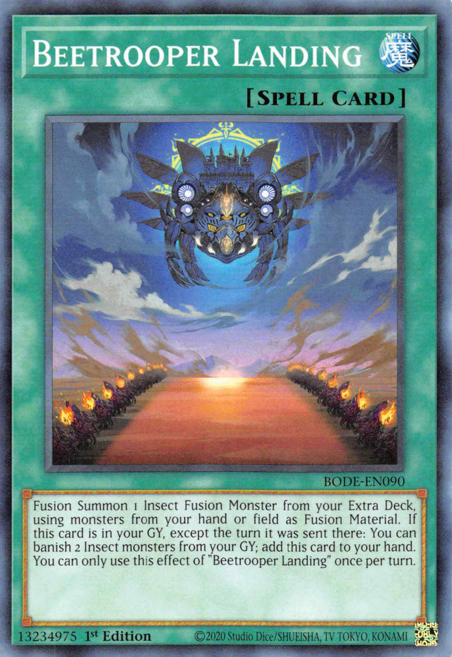 Fusion Summon 1 Insect Fusion Monster from your Extra Deck, using monsters from your hand or field as Fusion Material. If this card is in your GY, except the turn it was sent there: You can banish 2 Insect monsters from your GY; add this card to your hand. You can only use this effect of "Beetrooper Landing" once per turn.