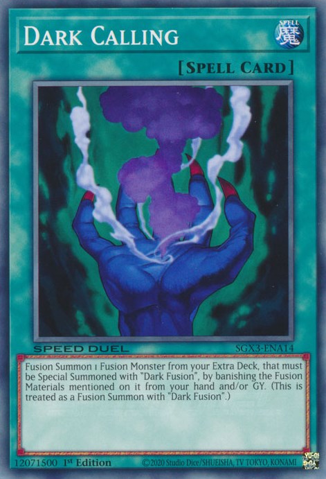 Fusion Summon 1 Fusion Monster from your Extra Deck, that must be Special Summoned with "Dark Fusion", by banishing the Fusion Materials listed on it from your hand and/or GY. (This is treated as a Fusion Summon with "Dark Fusion".)