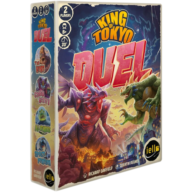 King of Tokyo Duel is a two-player tug-of-war dice game in the King of Tokyo line. Choose your uniquely-powered monster and roll new dice to draw the fame and destruction tokens toward you...or smash your rival with new special power cards to become the ultimate King of Tokyo!