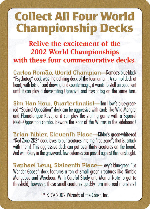 Carlos Romao, World Champion— Romao's blue-black "Psychatog" deck was the defining deck of the tournament. A control deck at heart, with lots of card drawing and countermagic, it wants to stall an opponent until it can play a devastating Upheaval and Psychatog on the same turn.