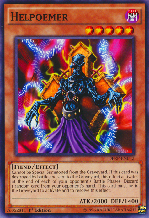 Cannot be Special Summoned from the Graveyard. If this card was destroyed by battle and sent to the Graveyard, this effect activates at the end of each of your opponent's Battle Phases: Discard 1 random card from your opponent's hand. This card must be in the Graveyard to activate and to resolve this effect.