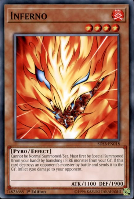 Cannot be Normal Summoned/Set. Must first be Special Summoned (from your hand) by banishing 1 FIRE monster from your GY. If this card destroys an opponent's monster by battle and sends it to the GY: Inflict 1500 damage to your opponent.